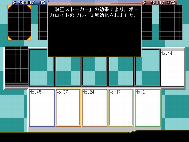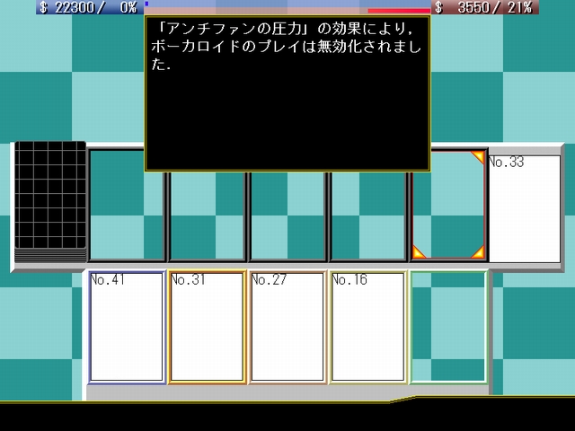 自分の人気が相手よりも30ポイント以上低い場合,相手がクラス5以上のボーカロイドをステージに出した時に使用できる.相手はそのボーカロイドのギャラの半分,このカードの使用者に資金を支払わなければ,そのボーカロイドは引退ゾーンに移動される.