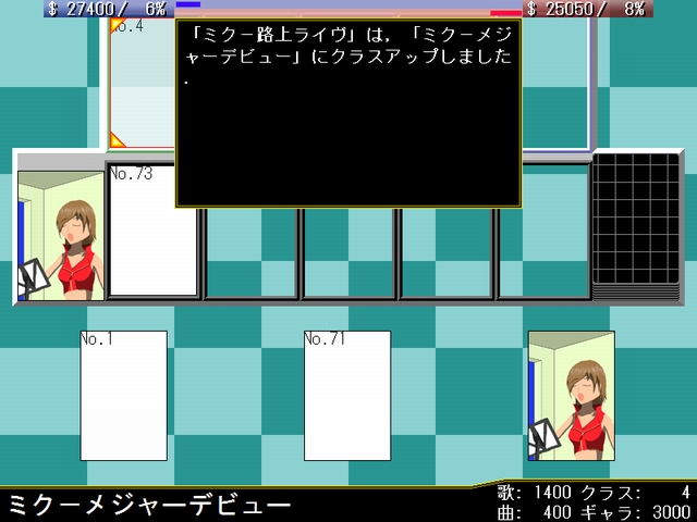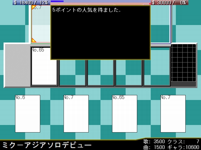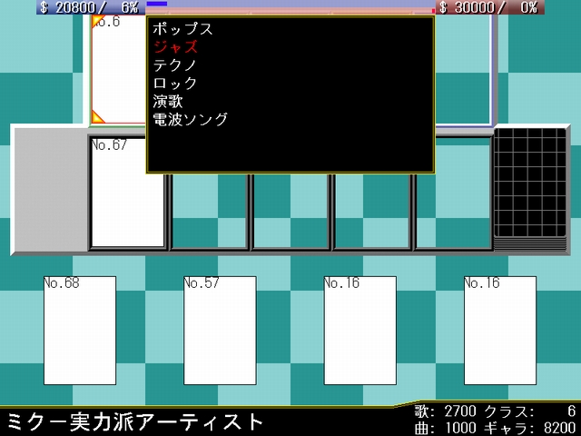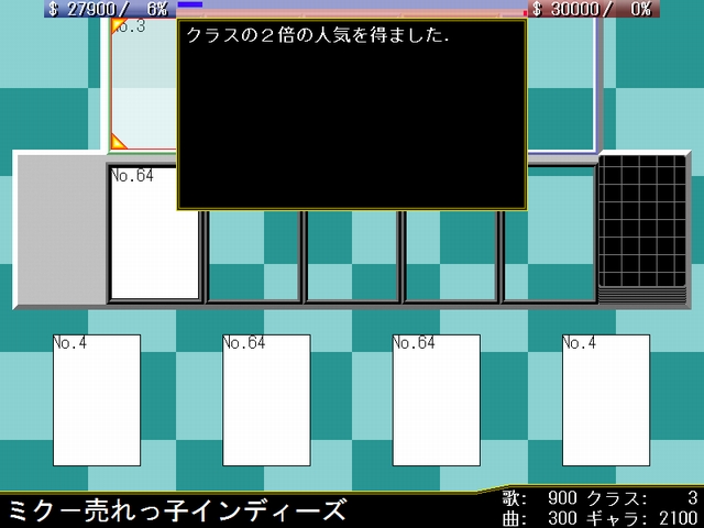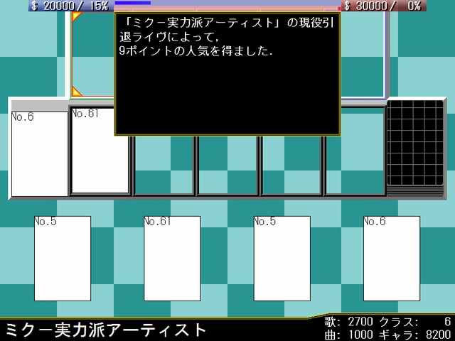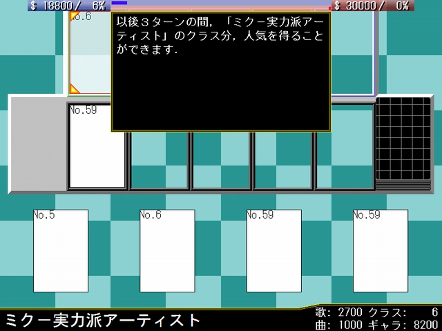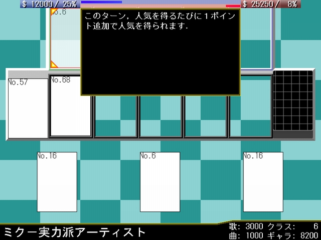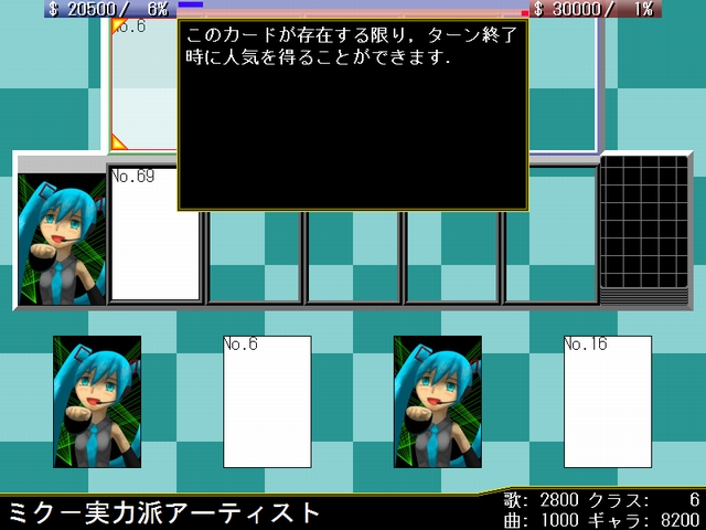 このカードの担い手として自分のステージに存在するクラス8以下のボーカロイドを1体指定し,作曲ジャンルをポップス,ジャズ,テクノ,ロック,演歌,電波ソングから1つ選択する.相手プロデューサに同様のジャンルから2つ選択させ,使用者が選択したジャンルと一致した場合,対象のボーカロイドのクラスの値分の人気と,作曲力の値分の資金を得る.一致しなかった場合,(3000-作曲力)分の資金を失う.