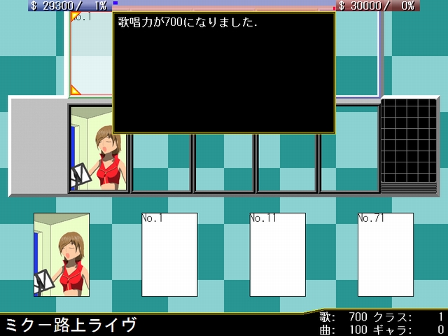 このカードの担い手として自分のステージに存在するボーカロイドを1体指定する.そのボーカロイドの作曲力÷1000ポイントの人気と,作曲力の半分の値だけ資金を得る.
